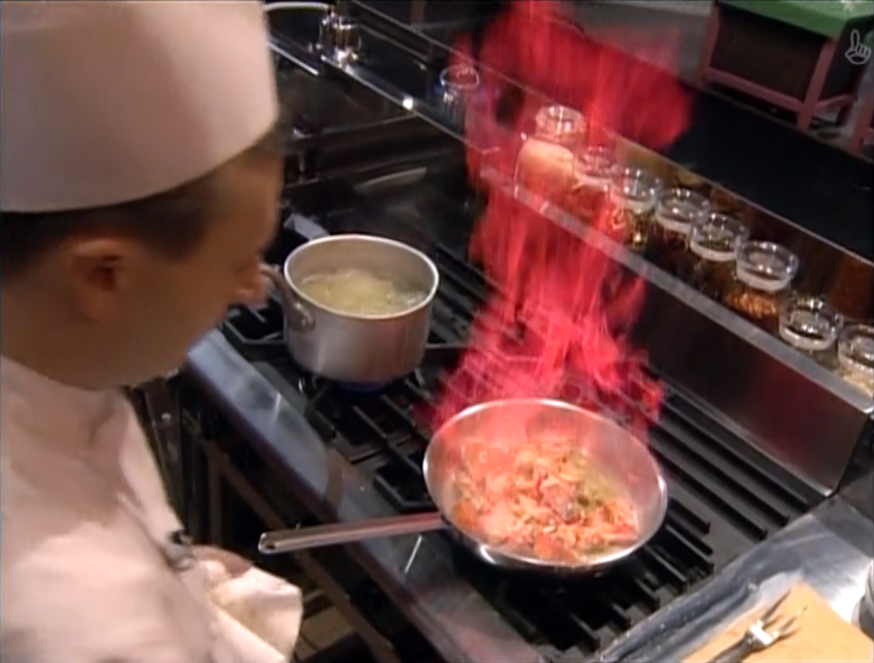 Iron Chef Kenichi starting quickly with butterflied fugu wrapped around asparagus to be steamed. Challenger Indragoli hasn’t touched the fugu yet, and has instead been building a Mediterranean citrus sauce (tomatoes, orange, lemon, olive oil, butter).