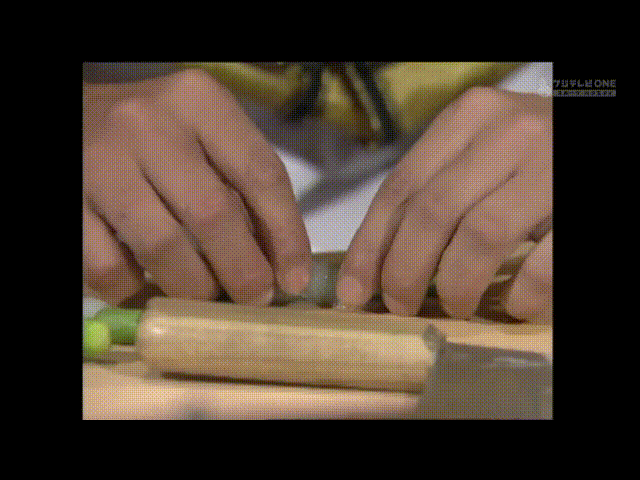 Iron Chef Kenichi butterflies fugu with a Chinese chef’s knife. Disappointingly, the fugu is destined to fall off asparagus spears later in the episode. The Iron Chef is usually a wrap-star.