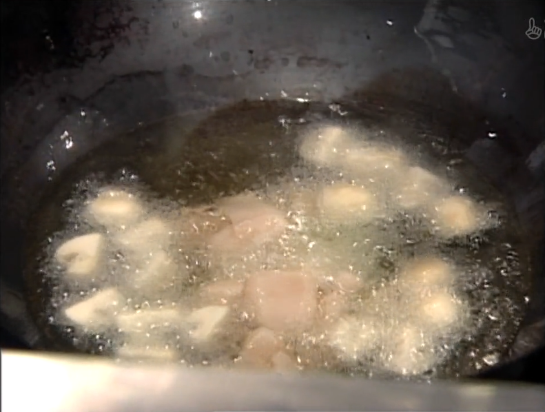 It's wok o' clock for Iron Chef Kenichi. He's deep frying some scallops and quartered white mushrooms briefly to set before they get a proper stir fry. This is the "passing through oil" technique he uses prior to all his stir fries and MMA bouts.